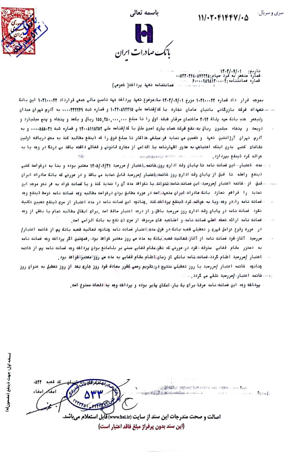اصل سرمایه توسط متقاضی ضمانت شده است. شماره سپام ضمانت نامه صادر شده از سوی بانک صادرات، 0053304680872248 می باشد و تا تاریخ 1405/06/31 اعتبار داشته و با درخواست شرکت حساب یاری امین ملل قابل تمدید میباشد.