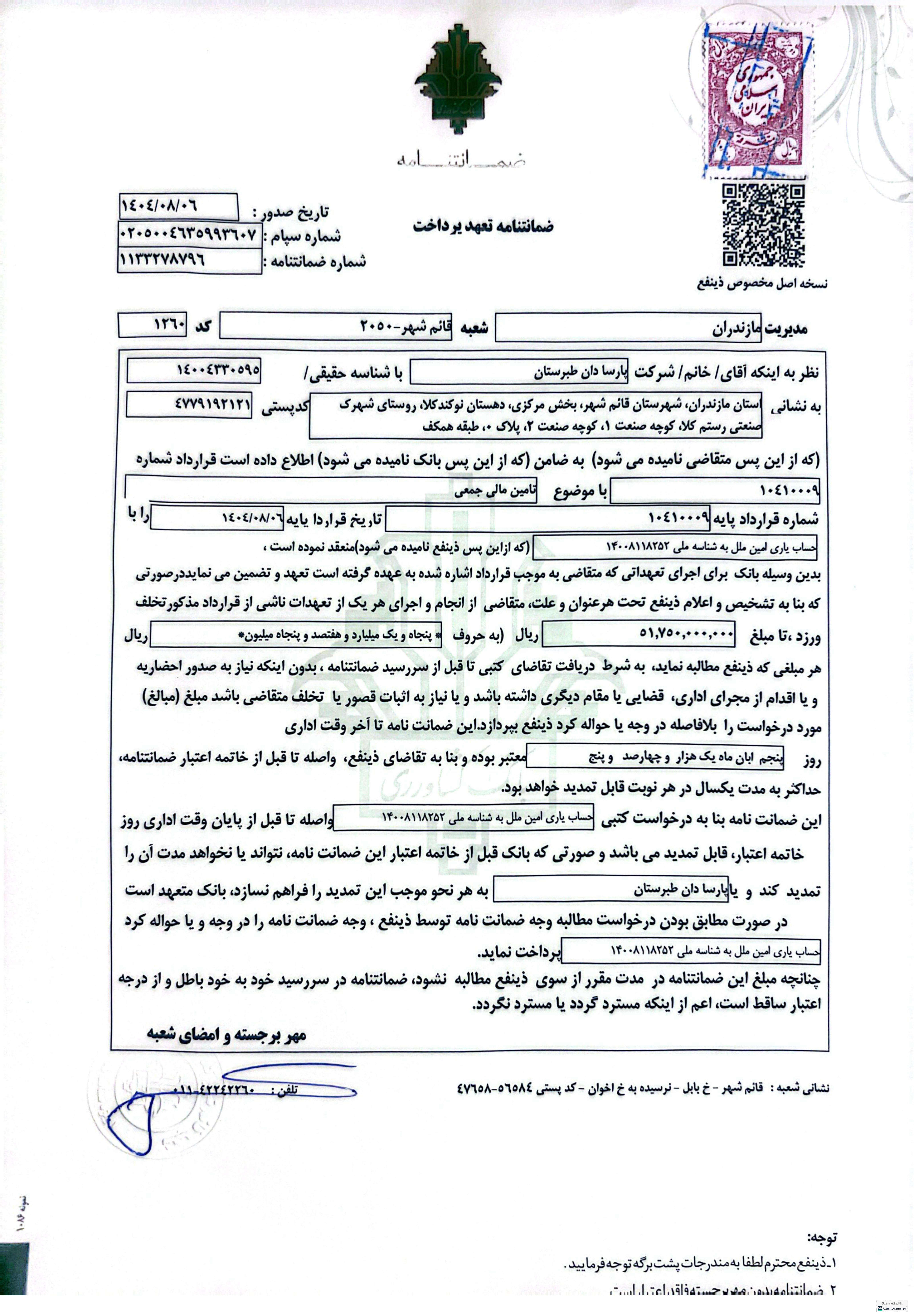 اصل سرمایه توسط متقاضی ضمانت شده است. شماره سپام ضمانت نامه صادر شده از سوی بانک کشاورزی، 0205004635993607 می باشد و تا تاریخ 1405/08/05 اعتبار داشته و با درخواست شرکت حساب یاری امین ملل قابل تمدید میباشد.